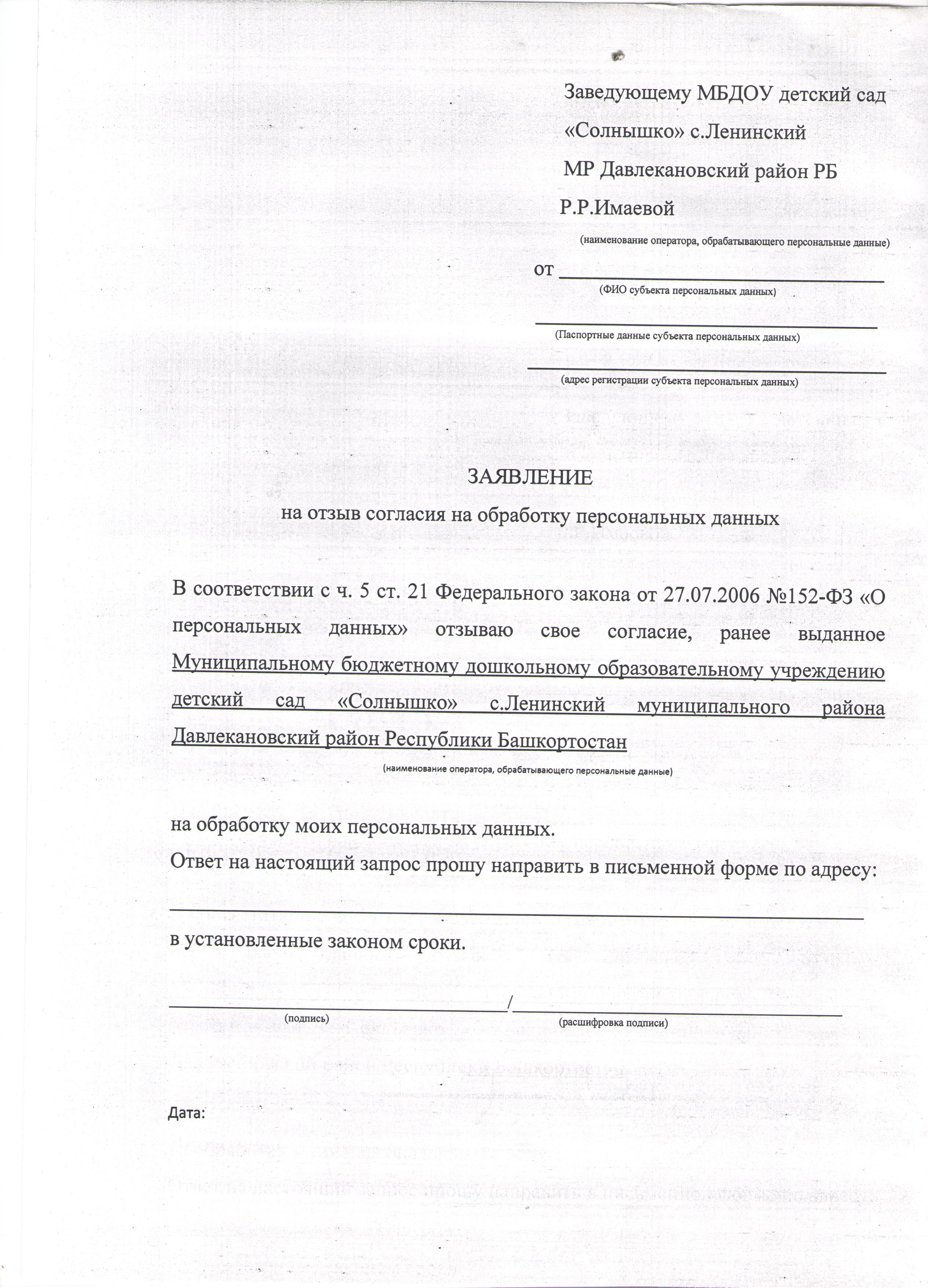 Уважаемые родители(законные представители) и сотрудники д/с "Солнышко" с.Ленинский! 27.07.2006г. был принят ФЗ №152-ФЗ "О персональных данных" для обеспечения защиты прав и свобод человека и гражданина при обработке его персональных данных, в том числе защиты прав на неприкосновенность частной жизни, личную и семейную тайну. Одной из причин принятия данного закона послужили многочисленные факты краж персональных данных в государственных и коммерческих структурах, их повсеместная продажа.Закон вступил в силу с 01.06.2011г. Действие закона распространяется не только на бумажные носителеи, но и на электронные средства(такие как автоматизированные информационные системы и электронные базы данных). МБДОУ д/с "Солнышко" является оператором, осуществляющим обработку персональных данных сотрудников, обучающихся(воспитанников) и их родителей (законных представителей) не совершенолетних обучающихся (воспитанников) детского сада, а также физических лиц, состоящих в иных договорных отношениях с МБДОУ д/с "Солнышко" с.Ленинский. Детский сад занесен в РЕЕСТР операторов, осуществляющих обработку персональных данных на сайте РОСКОМНАДЗОРА. Сейчас в нашем детском саду собираются , хранятся, обрабатываются передаются в вышестоящие инстанции персональные данные сотрудников, обучающихся (воспитанников). Для соблюдения требований закона "О персональных данных" д/с должен получить от сотрудников и родителей (законных представителей) каждого обучающегося (воспитанника) СОГЛАСИЕ НА ОБРАБОТКУ ПЕРСОНАЛЬНЫХ ДАННЫХ (на основании ст6, п.1№152"О персональных данных"") МБДОУ д/с "Солнышко" с.Ленинский обрабатывает и защищает сведения о сотрудниках, обучающихся (воспитанников) и их родителей (законных представителей) на правовом основании. Правовое основание защиты персональных данных:-Конституция РФ; Федеральный закон от 27.07.2006г.№152-ФЗ "О персональных данных" Федеральный закон от 29.12.2012г №273-ФЗ"Об образовании в Российской Федерации" Федеральный закон от 30.12.2001г. №195-ФЗ "Кодекс Российской Федерации об административных правонарушениях"(ст.13.11 Нарушение установленного законом порядка сбора, хранения, использования и распространения информации о гражданах (персональных данных)"). Федеральный закон от 13.06.1996г.№63-ФЗ "Уголовный кодекс Российской Федерации(ст.137 "Нарушение неприкосновенности в частной жизни"). Трудовой кодекс Российской Федерации от 30.12.2001г;197 -ФЗ (ст85-90); Постановление правительства РФ от 17.11.2007г. №781"Об утверждении Положения об обеспечении безопасности персональных данных при их обработке в информационных системах персональных данных" Постановление Правительства РФ от15.09.2008 №687 "Об утверждении Положения об особеннастях обработки персональных данных, осуществляемой без использования средств автоматизации"; Совместный приказ ФСТЭК России №55, ФСБ России №86, Мининформсвязи России№20 от 13.02.2008г. "Об утверждении порядка проведения классификации информационных систем персональных данных"; Гражданский Кодекс РФ; Налоговый кодекс РФ; Устав МБДОУ д/с "Солнышко" с.Ленинский; Цель обработки персональных данных:обеспечение наиболее полного исполнения образовательным учреждением своих обязанностей, обязательств и компетенций, определенных ФЗ "Об образовании Российской Федерации", а также иными нормативно-правовыми актами РФ в области образования. Опер